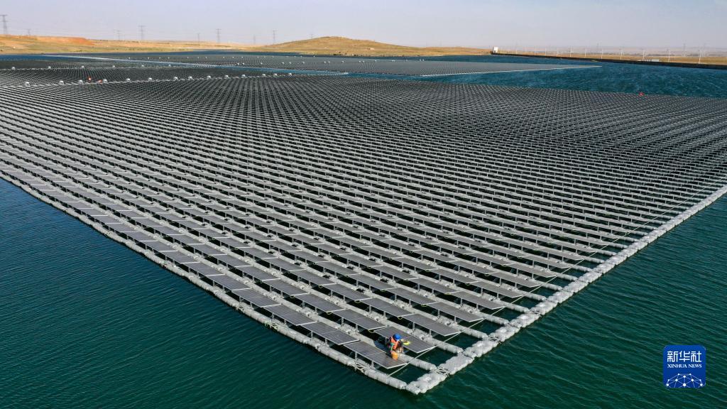 這是2022年6月17日拍攝的國家能源集團寧夏電力公司寧東電廠3×5.98兆瓦漂浮分布式光伏發電項目(無人機照片)。