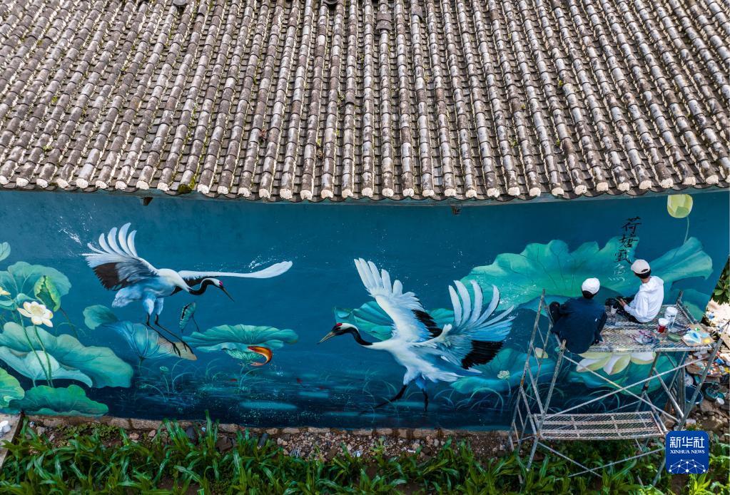 2022年6月24日,“95后”公益墻繪師劉志誠(右)在云南省麗江市永勝縣三川鎮(zhèn)進行墻繪創(chuàng)作(無人機照片)。他在家鄉(xiāng)程海鎮(zhèn)、三川鎮(zhèn)的多個村子里畫了20多幅不同主題的墻繪,給村莊增添了斑斕色彩,吸引了不少游客前來“打卡”。