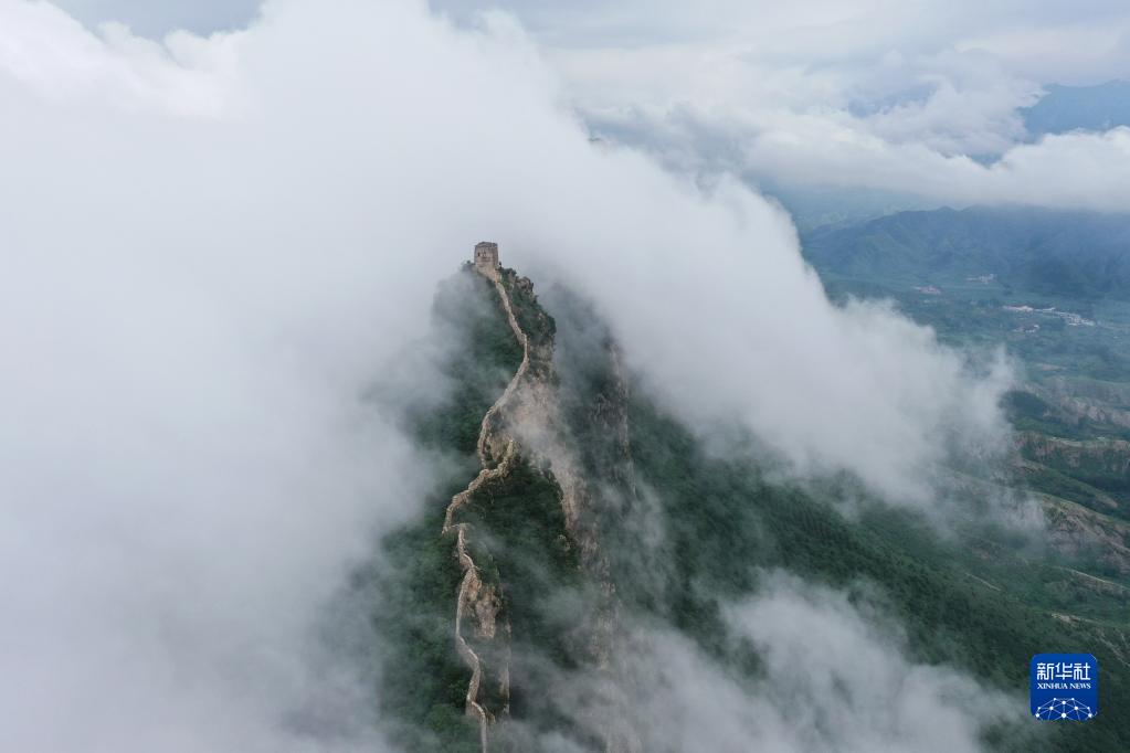 這是2022年7月4日拍攝的云霧中的長城望京樓(無人機照片)。大雨過后,位于北京市密云區和河北省灤平縣交界處附近的長城云霧繚繞,如同水墨畫一般。