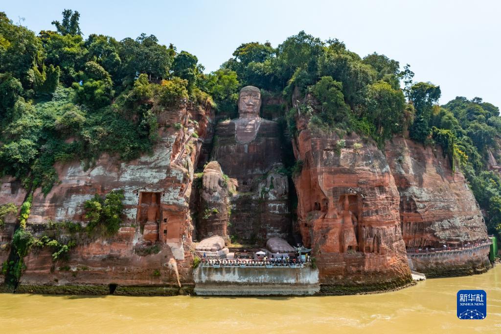 這是2022年8月23日拍攝的露出底座的樂山大佛(無人機(jī)照片)。持續(xù)高溫晴熱天氣使四川省多地出現(xiàn)不同程度的旱情,長江上游的主要支流岷江、青衣江和大渡河三條水系的上游來水均少于往年同期,導(dǎo)致樂山大佛前方的三江匯流處水位持續(xù)降低,部分河床與江灘裸露,樂山大佛罕見露出底座。