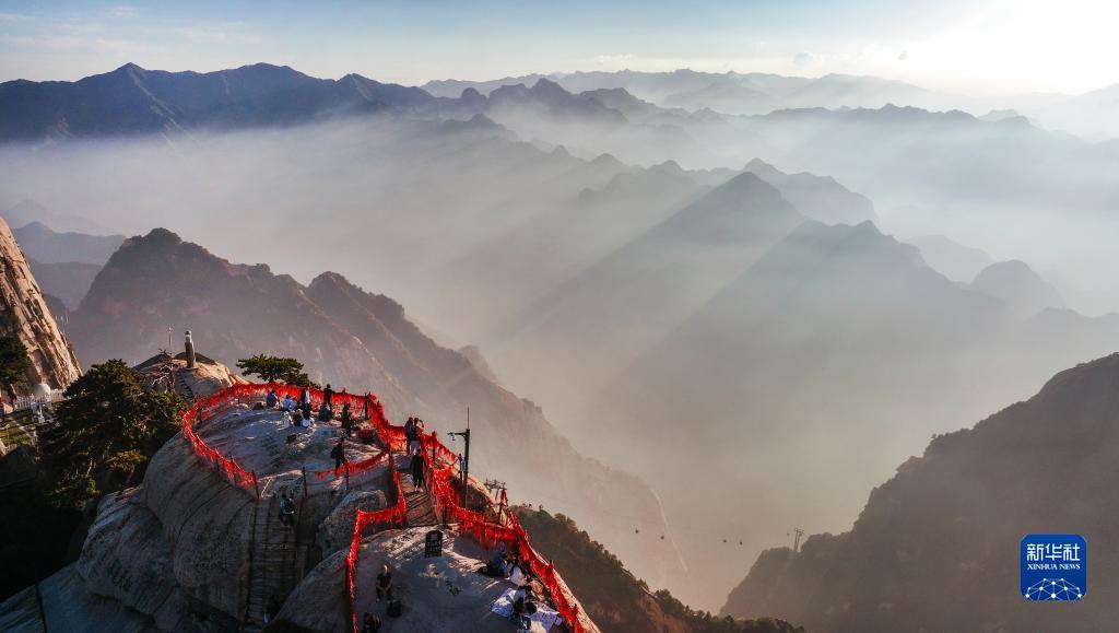 2022年9月25日,夕陽西下,雨后初霽的西岳華山,云霧縈繞,宛如仙境(無人機照片)。