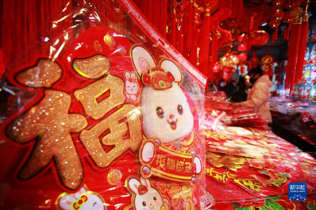 1月9日,在江蘇省揚(yáng)州市一處小商品市場(chǎng),居民在選購節(jié)慶飾品。新華社發(fā)(孟德龍 攝)