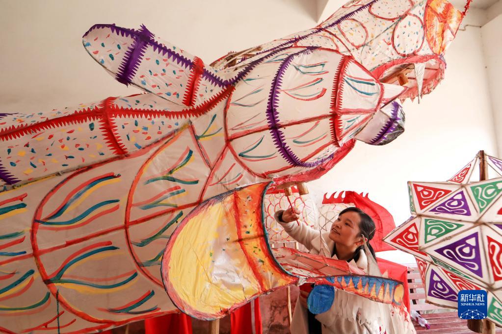 1月9日,村民在貴州省黔東南苗族侗族自治州岑鞏縣水尾鎮(zhèn)新場村繪制龍燈。
