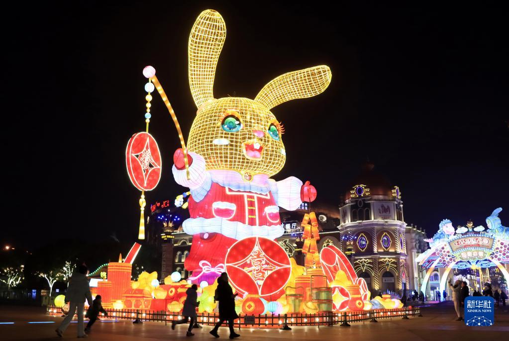 1月9日,在江蘇省常州市,市民在“2023常州燈會”現場觀賞巨型生肖兔燈。