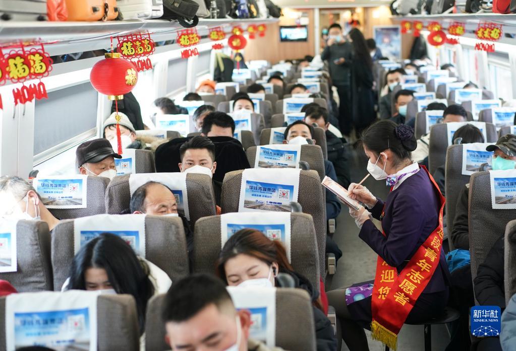 當日,中國鐵路上海局集團有限公司南京客運段高鐵二車隊在D376次列車上開展“回家路上的笑容”繪畫活動,列車員現場為旅客作畫,送上新年祝福。
