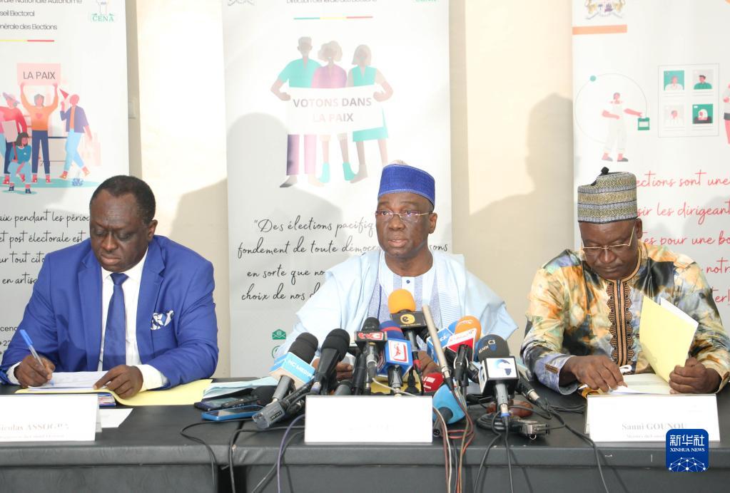 1月11日,貝寧全國(guó)選舉自治委員會(huì)主席薩卡·拉菲亞(中)在科托努公布國(guó)民議會(huì)選舉初步結(jié)果。