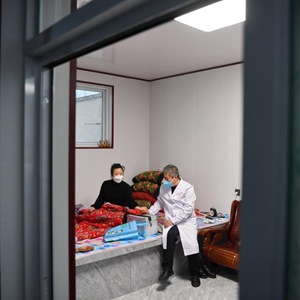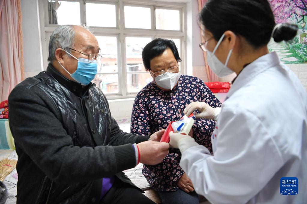 1月11日,河北省唐山市豐南區嶺子上村“農村巡診小分隊”村醫董秀芹(右)來到村民家中發放“健康禮包”。