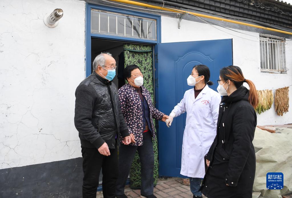 1月11日,河北省唐山市豐南區嶺子上村“農村巡診小分隊”村醫董秀芹(右二)和網格員楊順利(右一)和村民話別。