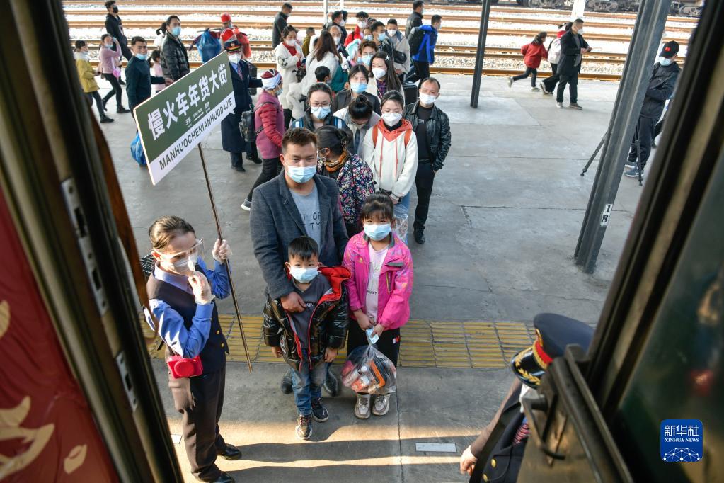 1月10日,旅客在貴州凱里站排隊準備登上5640次列車出行。