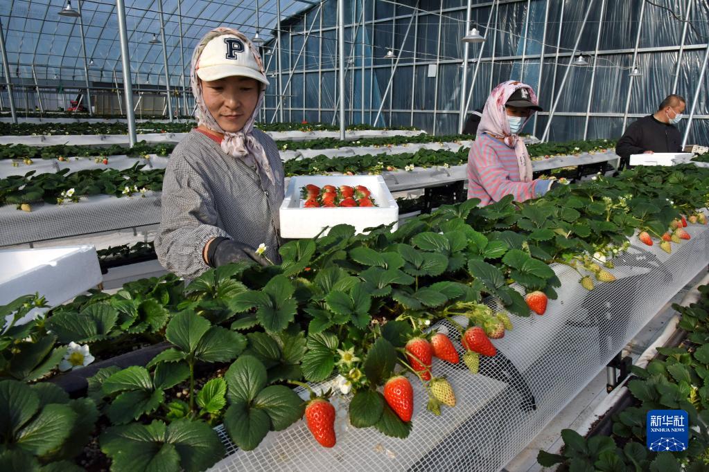 1月11日,山東省平度市舊店鎮(zhèn)東店子村村民在智能溫室采摘草莓。