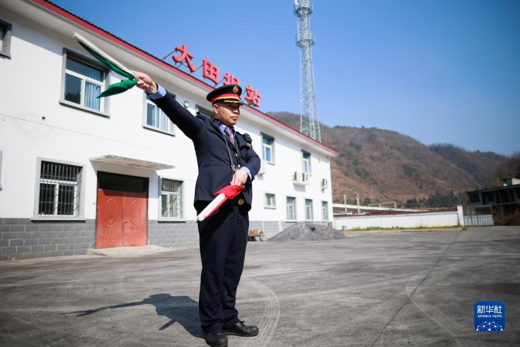毛忠輝在大田壩車站內利用休息時間練習信號操(1月11日攝)。