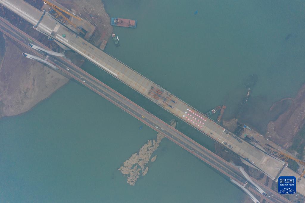 這是李家沱長江復線橋(右)合龍施工作業現場(1月12日攝,無人機照片)。