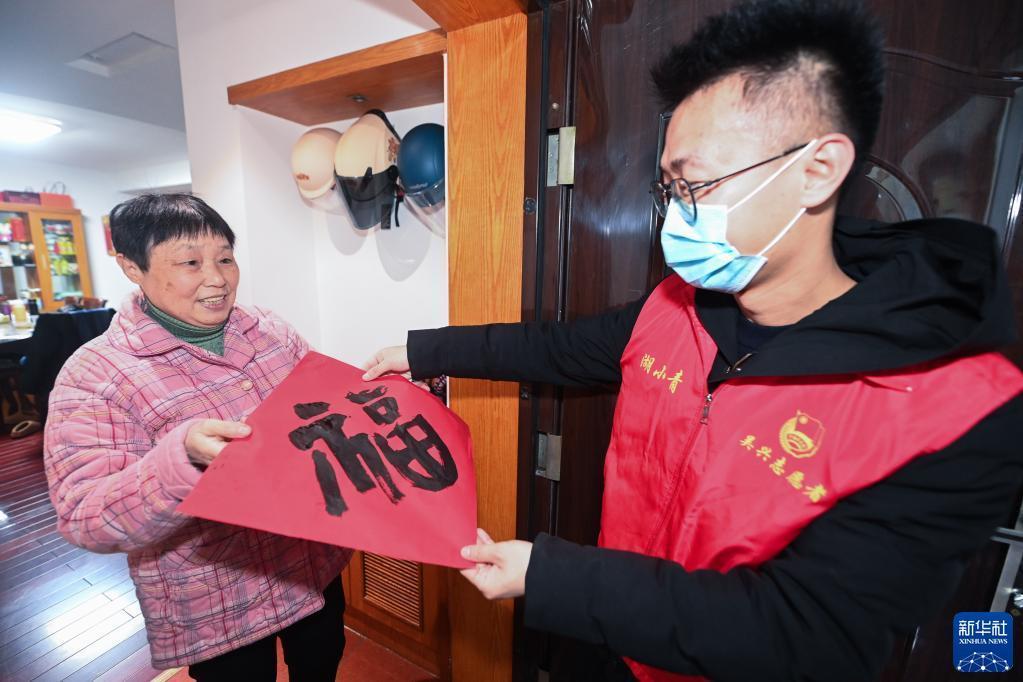 1月12日,在飛英街道竹翠園社區新世紀花苑小區,志愿者為居民上門送節日問候。