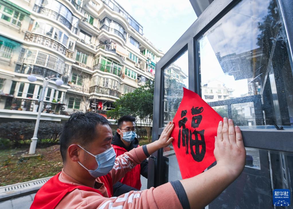 1月12日,在飛英街道竹翠園社區(qū)新世紀(jì)花苑小區(qū),志愿者在小區(qū)樓道門上貼福字。