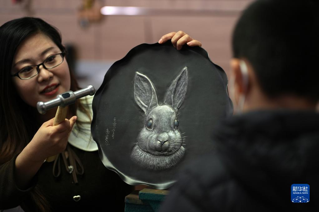 1月12日,在石家莊市新華區一個文化工作室,一名鐵板浮雕藝人向觀眾展示生肖兔作品。