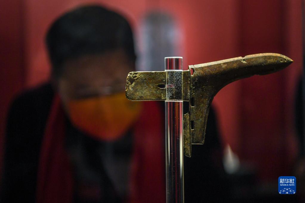 1月12日,觀眾在大云山漢王陵博物館參觀西漢“鎏金銅戈”。