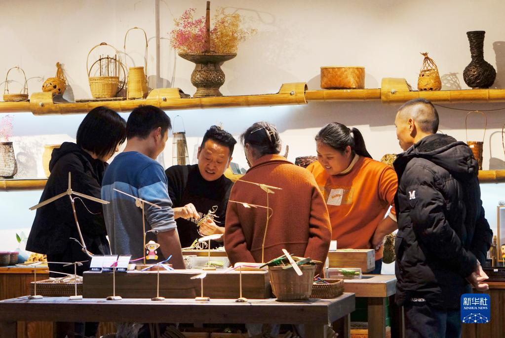 1月12日,福建武夷山竹編技藝傳承人謝宏星(左三)向顧客推薦自己的竹編產品。