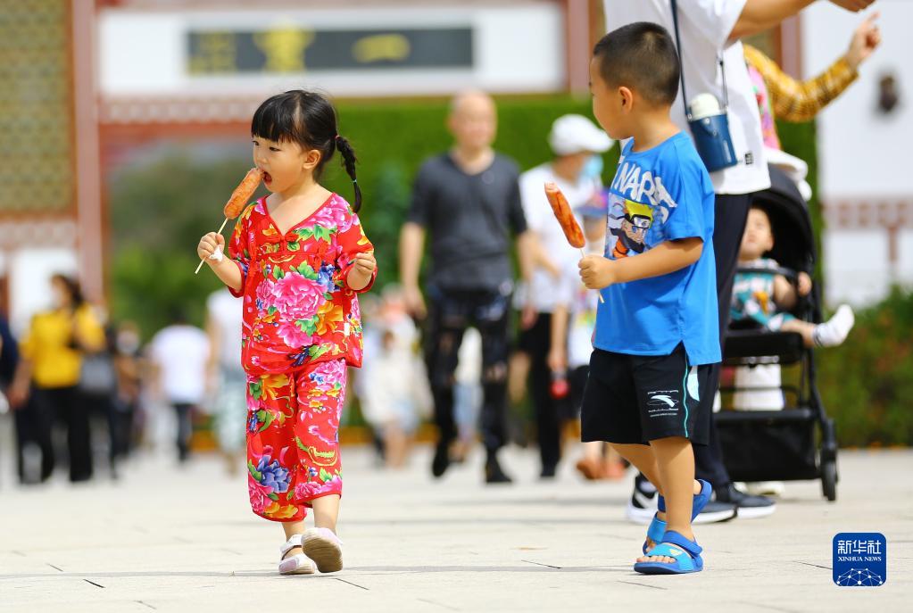 1月12日,小朋友在海南省三亞南山文化旅游區吃小吃。