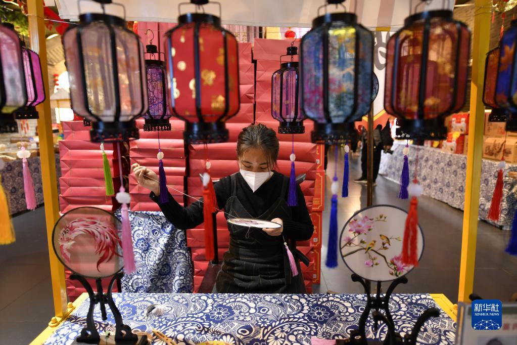 1月12日,刺繡藝人在河北省唐山市豐潤區2023“非遺”年貨節上展示刺繡技藝。