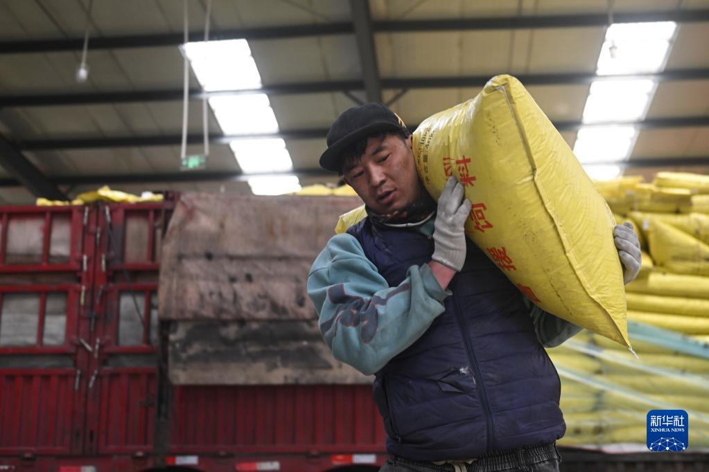 1月12日,青海省剛察縣一家飼料生產企業,工作人員在搬運成品飼料。