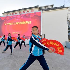 1月10日,在元古堆村村民廣場(chǎng),學(xué)生們?cè)谂啪毚和淼墓?jié)目。