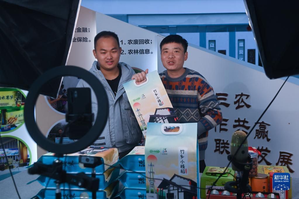 1月13日,在太湖源鎮(zhèn)黨群服務(wù)中心的直播間,吳旭東(右)和創(chuàng)業(yè)伙伴吳斌一起吆喝自己種植的大米。