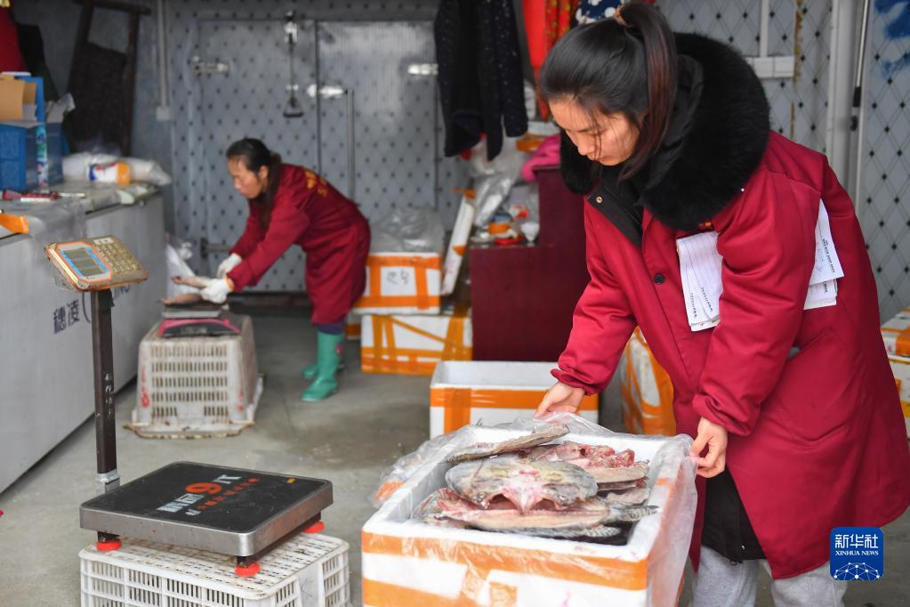 1月13日,在岳陽市君山區錢糧湖鎮六門閘社區生態漁村,居民將風干魚稱重、打包。