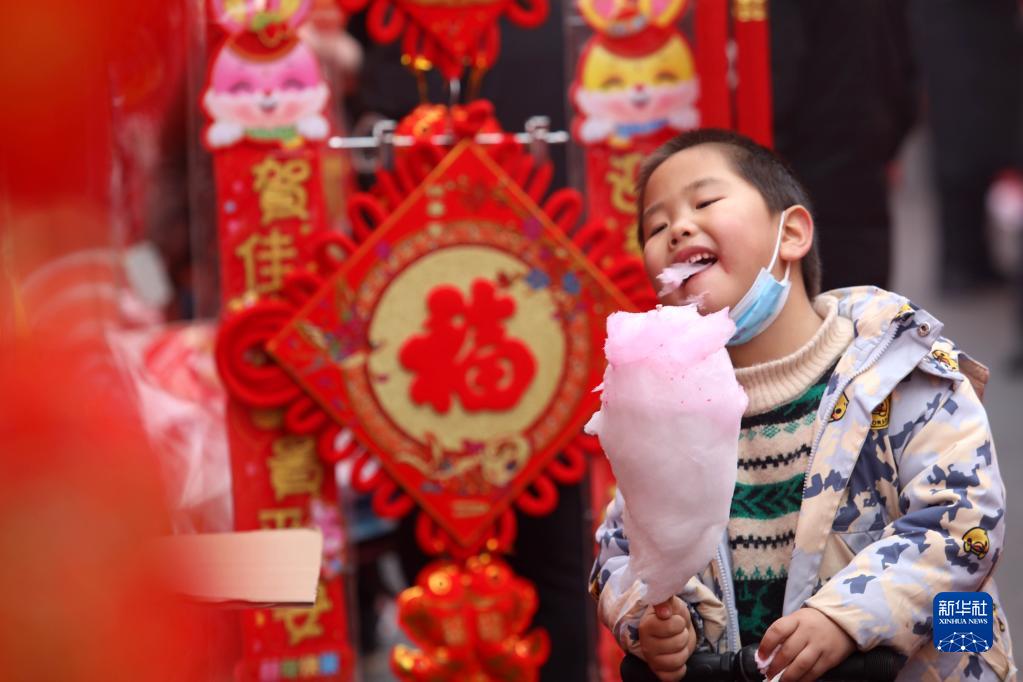 1月13日,一名小朋友在河北石家莊正定年貨大集上吃棉花糖。
