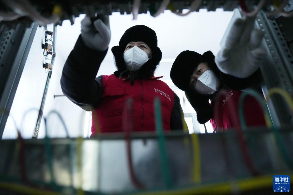 1月11日,國網撫遠市供電分公司抓吉供電所所長白樺先(左)和工友費義偉在查看當地一家供熱企業的用電設備運行情況。