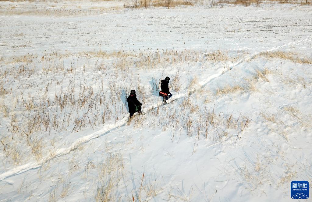 1月12日,國網撫遠市供電分公司抓吉供電所所長白樺先(左)和工友費義偉在巡視東極線(無人機照片)。