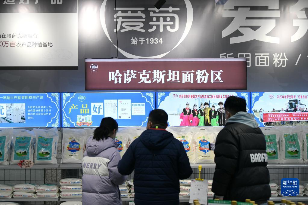 1月13日,在位于西安國際港務區的愛菊健康生活體驗館,消費者挑選哈薩克斯坦面粉產品。