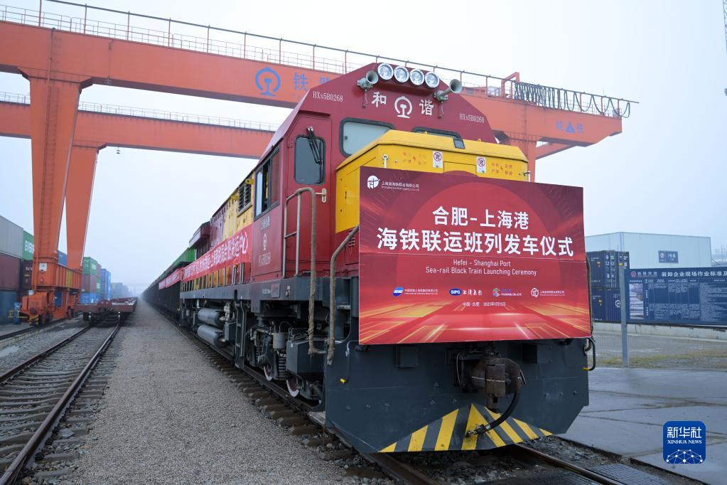 1月13日,在合肥北站物流基地,2023年合肥開往上海的首趟海鐵聯(lián)運班列即將發(fā)車。