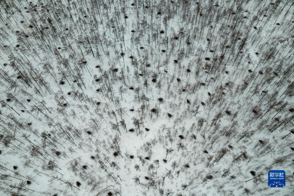 這是1月11日拍攝的漠河林場撫育作業(yè)點已經(jīng)完成林間清理作業(yè)的樹枝堆(無人機照片)。