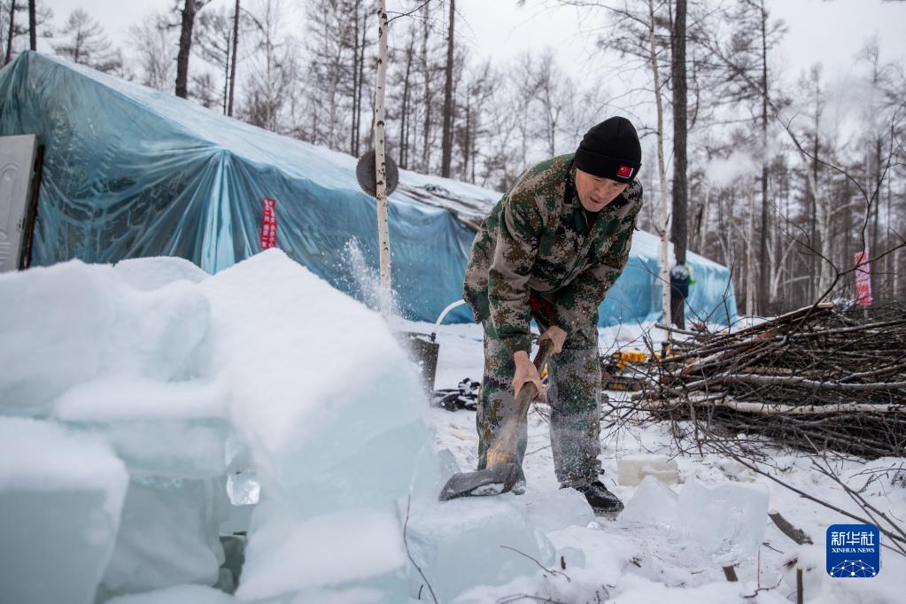 1月11日,在漠河林場管護區作業點臨時帳篷外,一名工人用斧子劈冰。