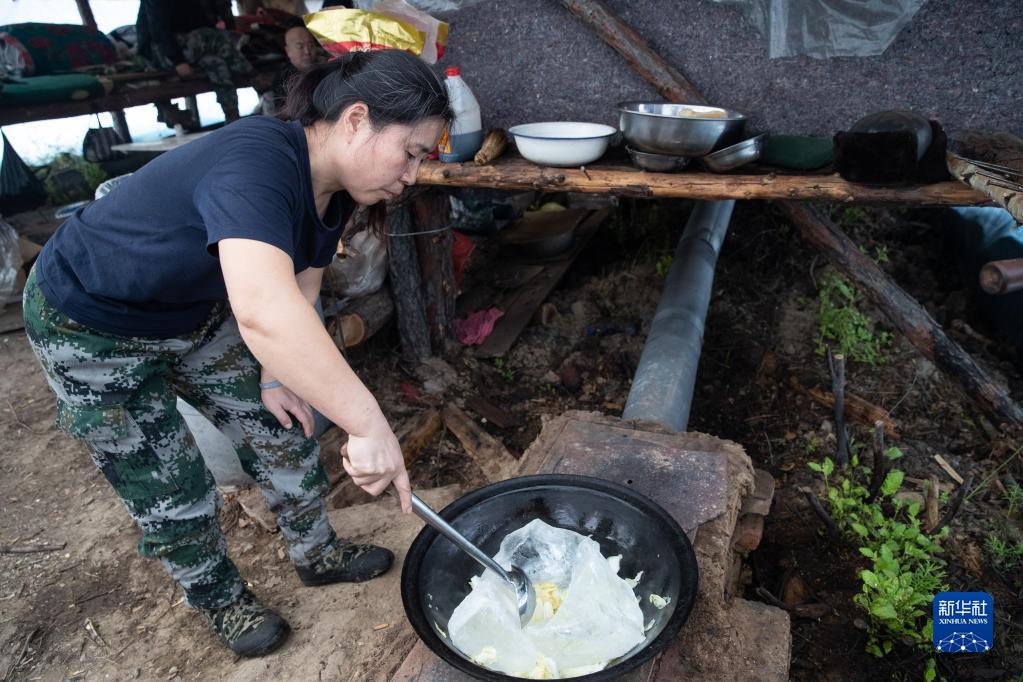 1月11日,在漠河林場管護區(qū)作業(yè)點臨時帳篷內,閆秀艷在用冰塊燉菜。