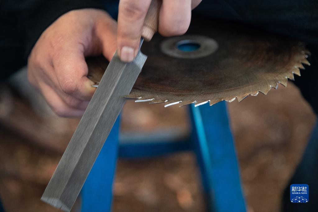 1月11日,在漠河林場管護區作業點臨時帳篷內,森林撫育工人在打磨刀鋸。