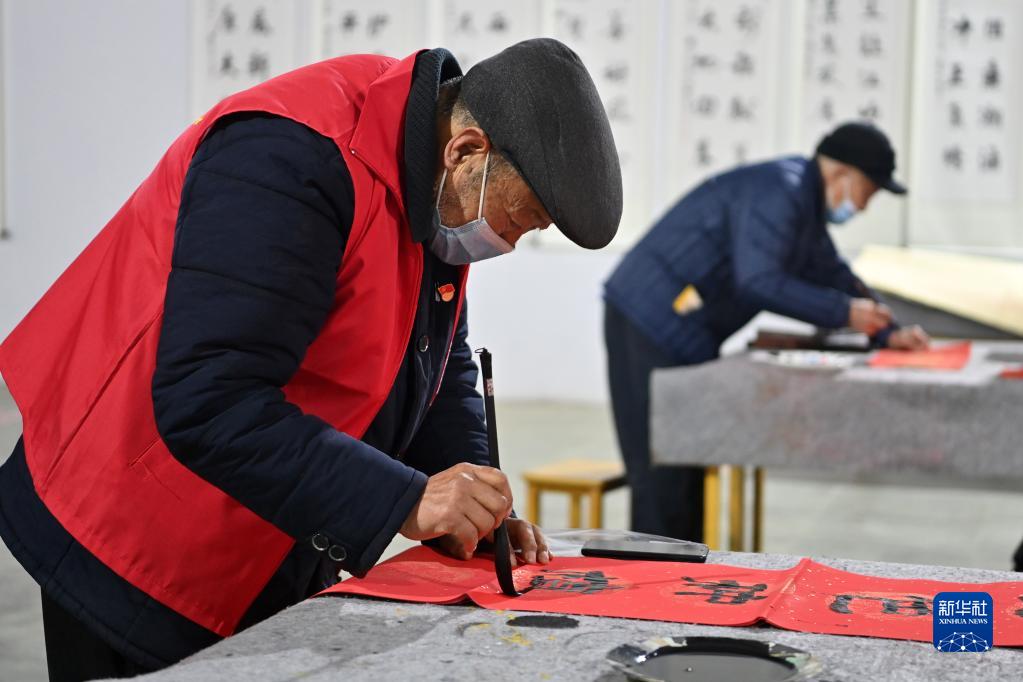 1月13日,寺底村村民在書寫春聯(lián)。