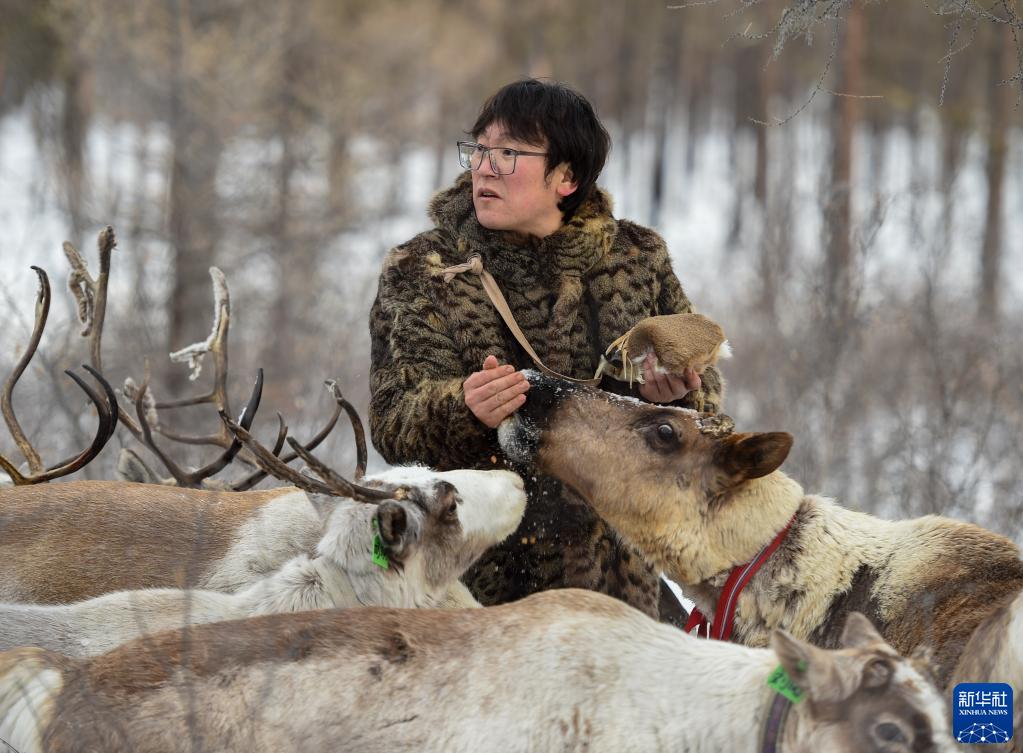 1月12日,覺樂在山林深處喂馴鹿吃豆餅。新華社記者 彭源 攝