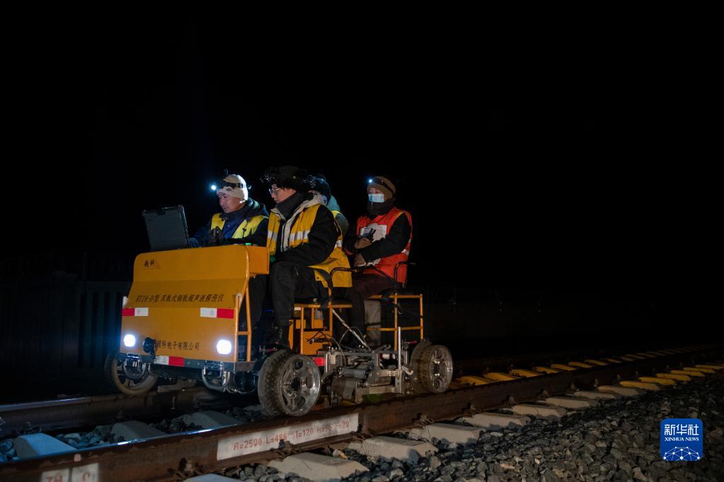 羅布(左)和同事在進行鋼軌探傷作業(1月12日攝)。