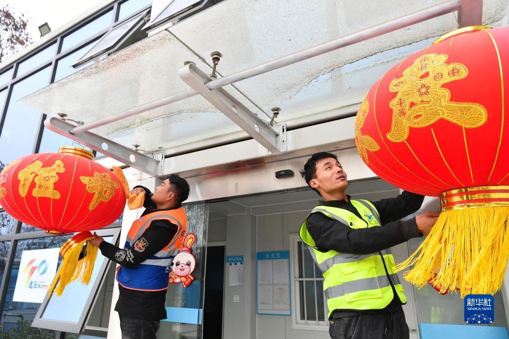 農歷小年來臨之際,陜西省西安市的建筑工地節日氣氛濃厚。建設者們貼福字、掛燈籠、寫春聯、包餃子,以多種形式迎接兔年春節的到來。