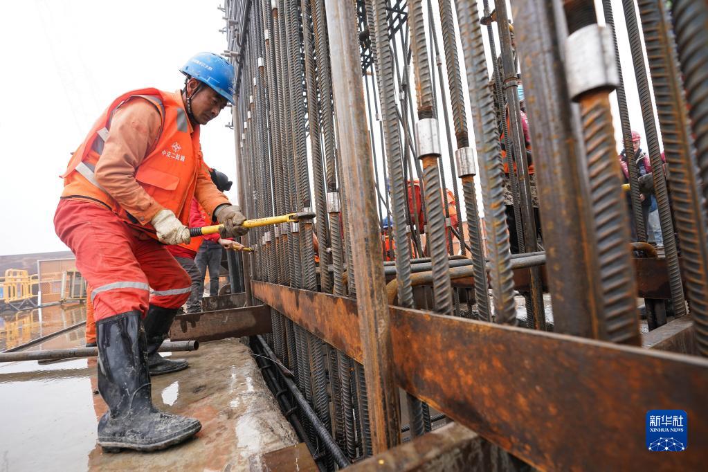 1月13日,工人在張靖皋長江大橋南航道橋南錨碇施工現場作業。