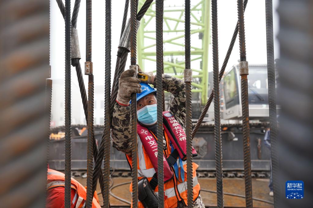 1月13日,工人在張靖皋長江大橋南航道橋南錨碇施工現場作業。