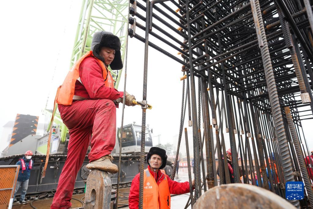 1月13日,工人在張靖皋長江大橋南航道橋南錨碇施工現場作業。