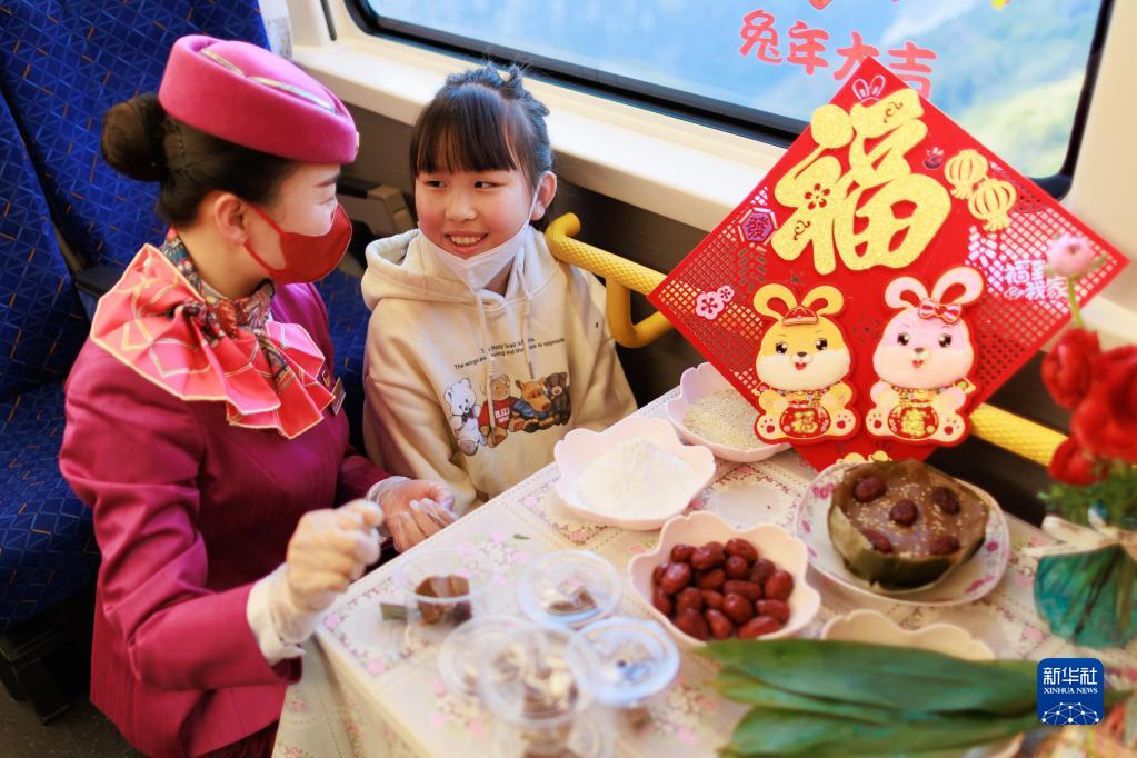 當(dāng)日,在貴陽北開往成都南的C5980次復(fù)興號(hào)高鐵列車上,乘務(wù)員們熱情邀請(qǐng)旅客們參與剪窗花、貼年畫、做年糕、畫糖畫等活動(dòng)。濃濃的新春喜慶氣氛在車廂內(nèi)洋溢,大家在歡聲笑語中一起迎接即將到來的小年。
