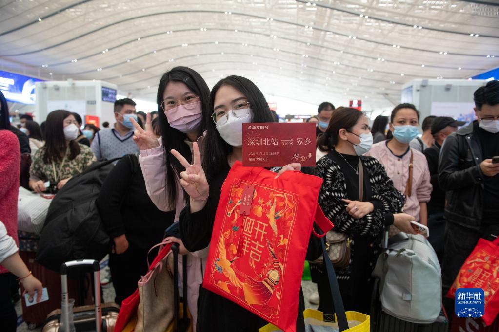 當日,G1008次愛心專列搭載著500多名長期在深圳工作的文明實踐志愿者從深圳北站駛往武漢。G1008次列車是深圳鐵路部門今年春運開出的第6趟愛心專列,暖心助力深圳地區的文明實踐志愿者和城市奮斗者及家人順利回家過年。新華社記者 毛思倩 攝