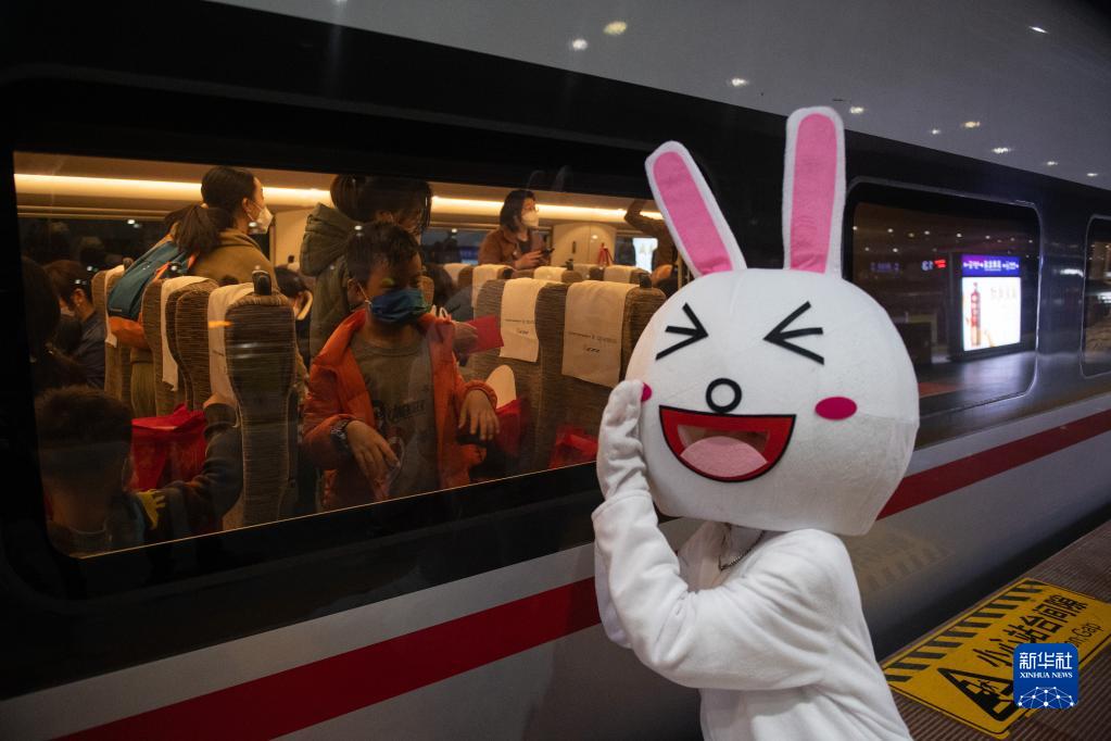 當日,G1008次愛心專列搭載著500多名長期在深圳工作的文明實踐志愿者從深圳北站駛往武漢。G1008次列車是深圳鐵路部門今年春運開出的第6趟愛心專列,暖心助力深圳地區的文明實踐志愿者和城市奮斗者及家人順利回家過年。新華社記者 毛思倩 攝
