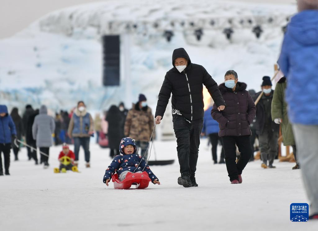 1月13日,家長帶著孩子在冰雪嘉年華上游玩。