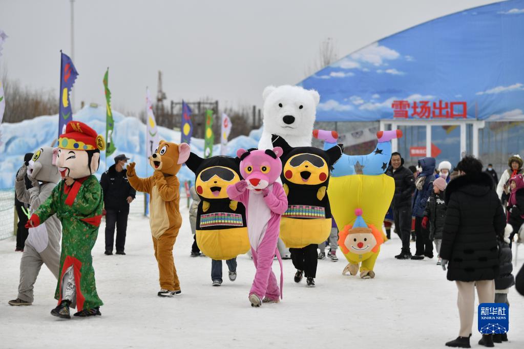 1月13日,演員在冰雪嘉年華現場與游客互動。