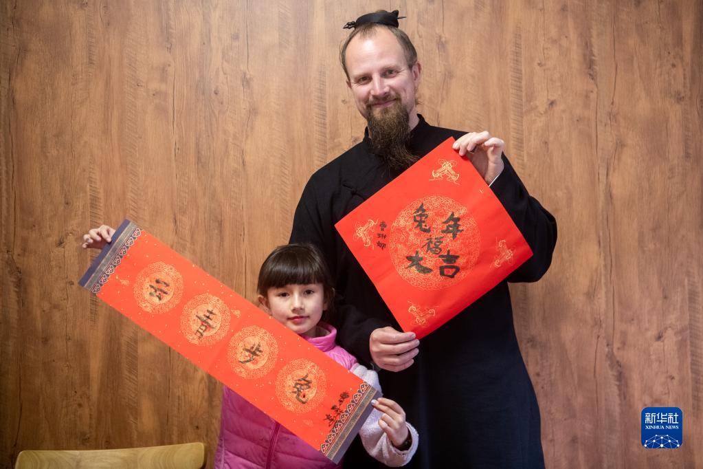1月12日,杰克和女兒展示自己寫的春聯和福字。