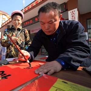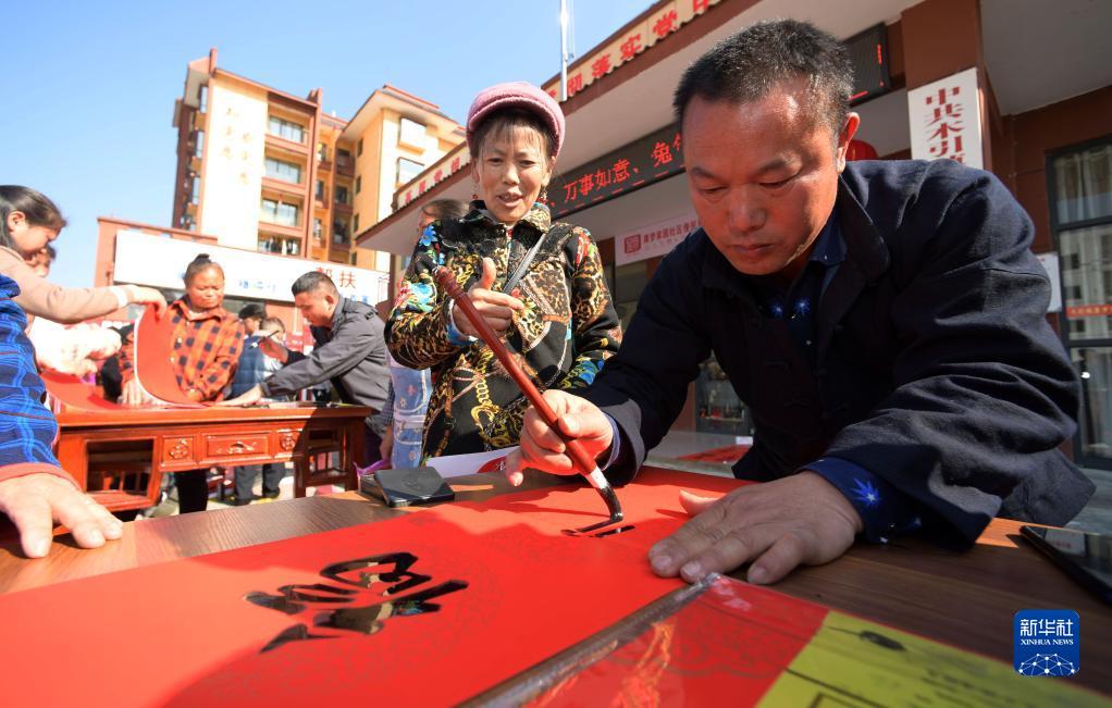 1月13日,書法愛好者(右一)在羅甸縣木引鎮康夢家園為群眾書寫春聯。